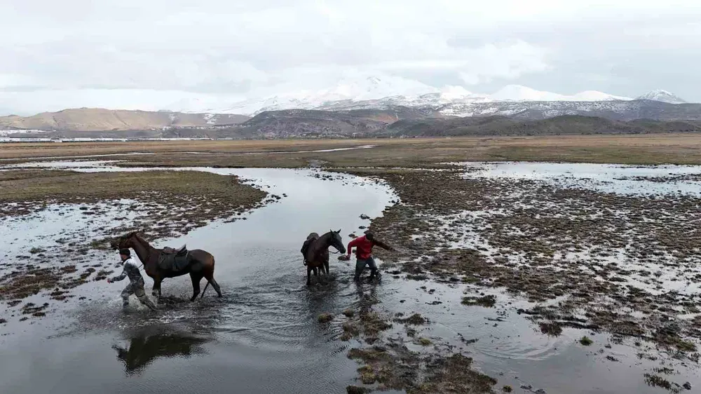 Kayseri’de iki doğaseverin atla olan gezisi görünmeyen bir kaza nedeniyle suda biterken, o anlar dron kamerasına yansıdı.