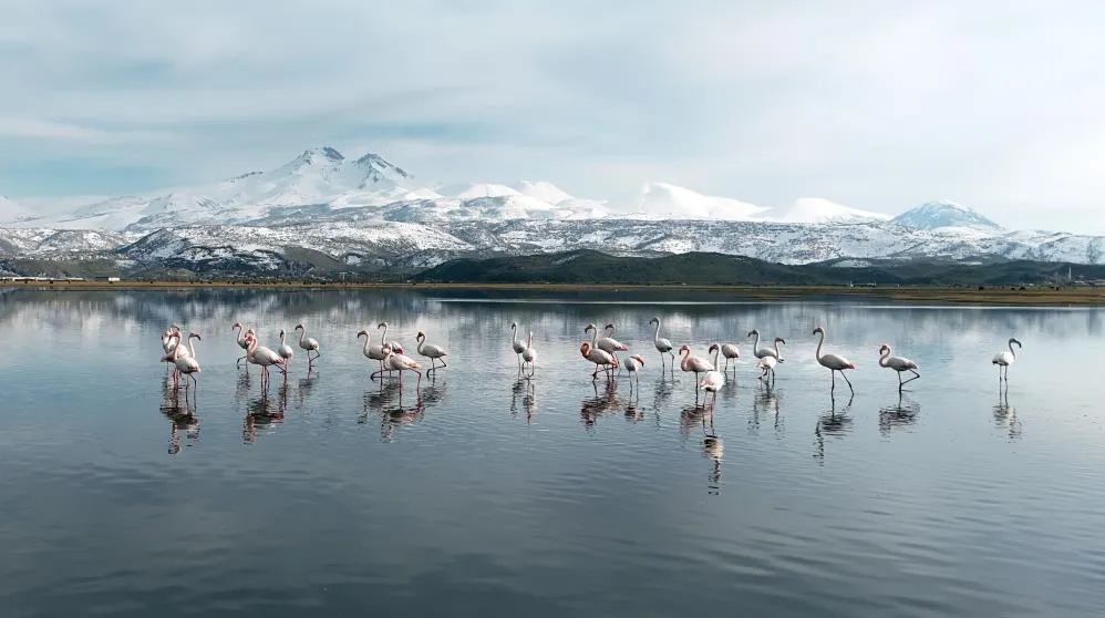 Kayseri’nin Hacılar ve İncesu ilçelerinin sınırları içerisinde yer alan Hürmetçi Sazlığı kentte etkili olan kar ve yağmur ile beraber suyla doldu. Alanın suyla dolmasıyla beraber ilk flamingo kafilesi de kente geldi. Sulak alana inen göçmen flamingolar Erciyes ile beraber görsel şölen oluşturdu.