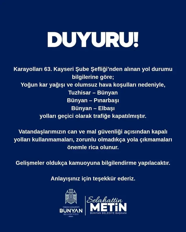 Başkan Selahattin Metin açıklamasında; "Karayolları 63. Kayseri Şube Şefliği’nden alınan yol durumu bilgilerine göre yoğun kar yağışı ve olumsuz hava şartları nedeniyle Tuzhisar - Bünyan, Bünyan - Pınarbaşı, Bünyan - Elbaşı yolları geçici olarak trafiğe kapatılmıştır. Vatandaşlarımızın can ve mal güvenliği açısından kapalı yolları kullanmamaları, zorunlu olmadıkça yola çıkmamaları önemle rica olunur" ifadelerini kullandı.