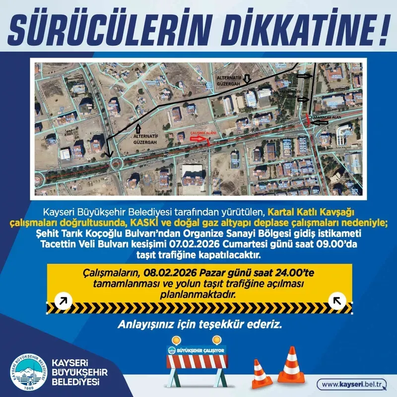 Kayseri Büyükşehir Belediyesi tarafından yapılan uyarıda, "Kayseri Büyükşehir Belediyesi tarafından yürütülen Kartal Kavşağı çalışmaları doğrultusunda; deplase çalışmaları nedeniyle Şehit Tarık Koçoğlu Bulvarı’ndan Organize Sanayi Bölgesi gidiş istikameti Tacettin Veli Bulvarı kesişimi 07.02.2026 Cumartesi günü saat 09.00’da taşıt trafiğine kapatılacaktır. Çalışmaların, 08.02.2026 Pazar günü saat 24.00’te tamamlanması ve yolun taşıt trafiğine açılması planlanmaktadır" ifadelerine yer verildi.