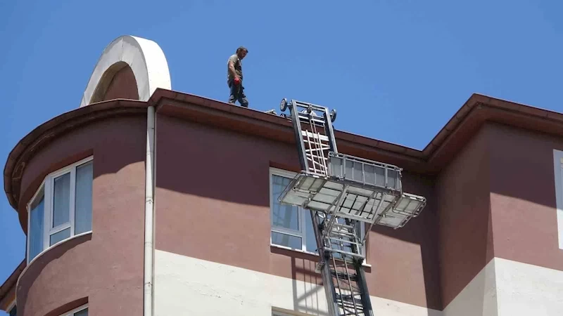 Kayseri’nin Melikgazi ilçesinde 10 katlı binada çatı tamiri yapan işçiler, hiçbir güvenlik önlemi almadan çalıştı. Canlarını hiçe sayan işçileri gören vatandaşların yüreği ağzına geldi.