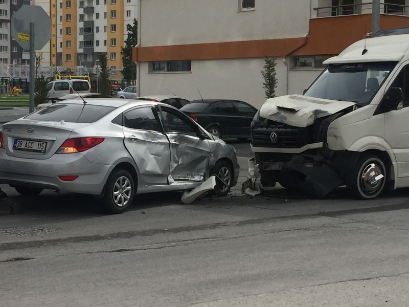 Edinilen bilgiye göreŞ Melikgazi ilçesine bağlı Battalgazi Mahallesi Karaburun Caddesi ile Doğuş Geçidi kavşağında Wosvagen Crafter marka 38 P 1212 servis minibüsü ile Hyundai Accent marka 38 ACC 115 plakalı araç kaza yaptı. Meydana gelen kazayı gören vatandaşların haber vermesi üzerine olay yerine ilk gelen 112 ekibi yaralılara müdahale etti. Polis ekipleri de sürekli kazanın meydana geldiği ileri sürülen yolda başka bir kazanın olmaması için önlem aldı.