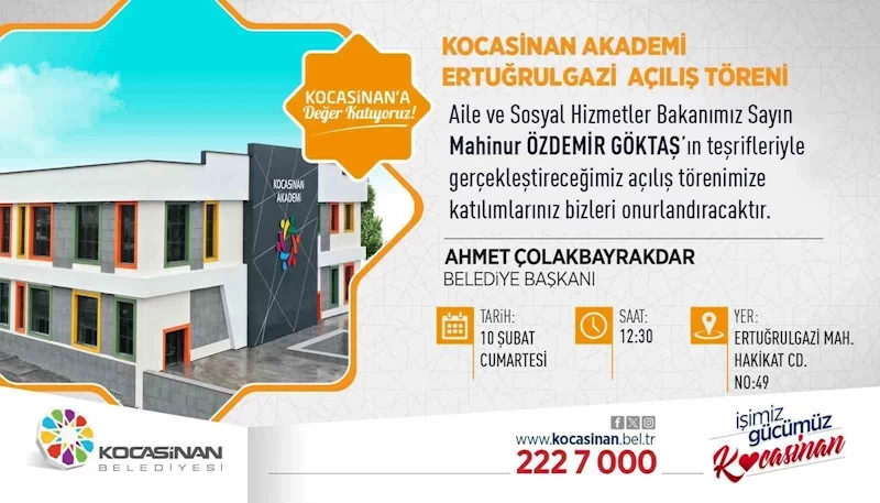 Kocasinan Belediyesi tarafından Erkilet Ertuğrulgazi Mahallesi’nde Kayseri’nin en büyük sosyal tesisi olan ve 6 bin 300 metrekare alan üzerine yapılan Kocasinan Akademi Tesisi’nin açılışı yapılacak. Açılışa; Aile ve Sosyal Hizmetler Bakanı Mahinur Özdemir Göktaş da katılacak.