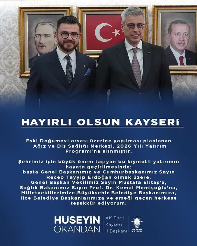 AK Parti Kayseri İl Başkanı Hüseyin Okandan, 2026 Yılı Yatırım Programına alınan Ağız ve Diş Sağlığı Merkezi için emeği geçenlere teşekkür etti.