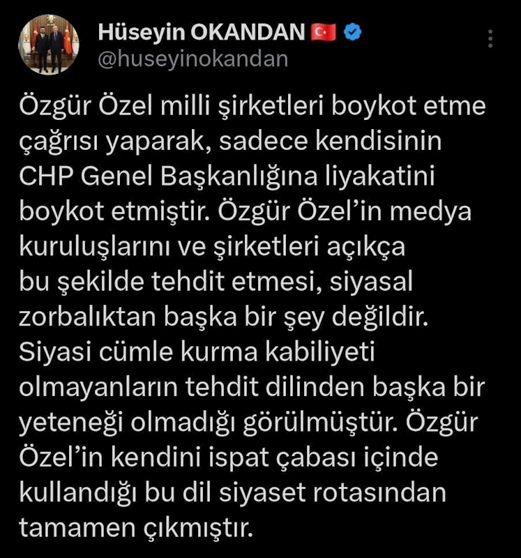"Özgür Özel milli şirketleri boykot etme çağrısı yaparak, sadece kendisinin CHP Genel Başkanlığına liyakatini boykot etmiştir. Özgür Özel’in medya kuruluşlarını ve şirketleri açıkça bu şekilde tehdit etmesi, siyasal zorbalıktan başka bir şey değildir. Siyasi cümle kurma kabiliyeti olmayanların tehdit dilinden başka bir yeteneği olmadığı görülmüştür. Özgür Özel’in kendini ispat çabası içinde kullandığı bu dil siyaset rotasından tamamen çıkmıştır."