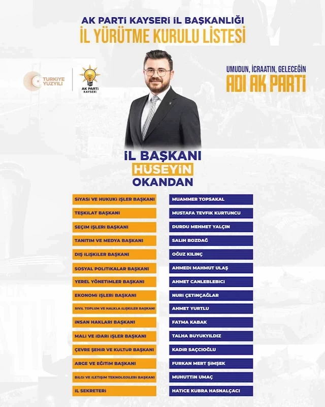 Hüseyin Okandan’ın AK Parti Kayseri İl Başkanı olduğu İl Yürütme Kurulu Listesi şu şekilde oluştu: