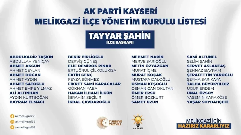 Geçtiğimiz günlerde AK Parti Melikgazi İlçe Başkanı olarak göreve Tayyar Şahin göreve getirilmişti. İlçe başkanlığının belirlenen yönetimi şu şekilde oluştu: