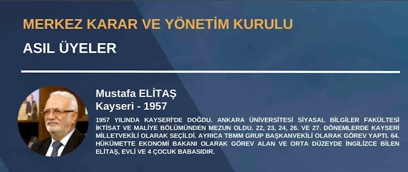 Ankara’da yapılan AK Parti 4. Olağanüstü Büyük Kongresi’nde Merkez Karar ve Yönetim Kurulu (MKYK) listesi belirlendi. Listede önceki dönem Ekonomi Bakanı Mustafa Elitaş ile Emir Yasin Kekeç partinin A Takımına girdi.