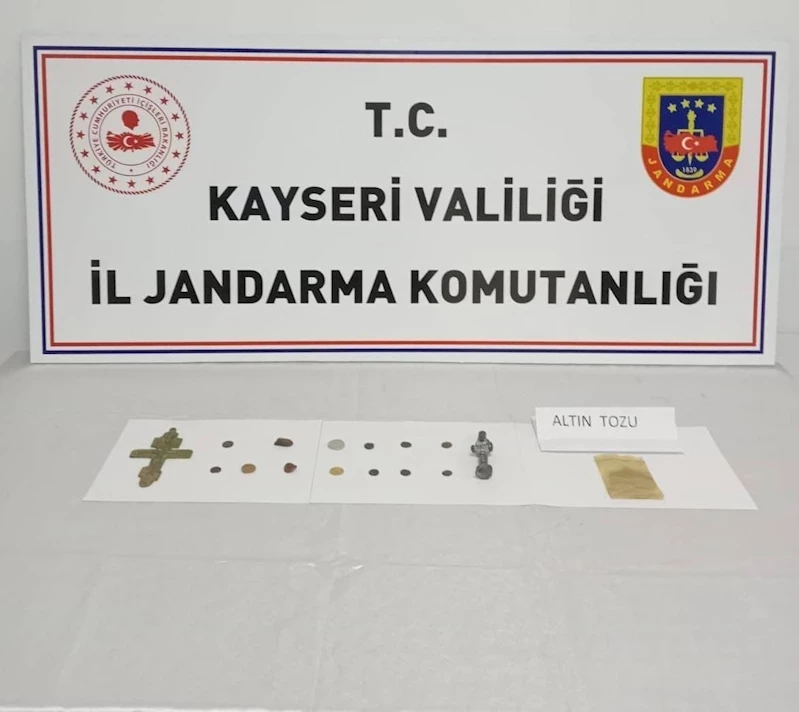 Kayseri İl Jandarma Komutanlığı İstihbarat Şube Müdürlüğü ve Melikgazi İlçe Jandarma Komutanlığı tarafından yapılan istihbari çalışmalar sonucunda Melikgazi ilçesine bağlı Hoca Ahmet Yesevi Bulvarı üzerinde bir araç durduruldu. Ekipler tarafından araçta ve sürücüsü H.K.’nin üzerinde yapılan aramalarda geçmiş dönemlere ait olduğu değerlendirilen 8 adet bronz, 1 adet gümüş, 1 adet altın olmak üzere toplam 10 adet sikke, 5 adet obje ve 20 gram altın tozu bulunu.
