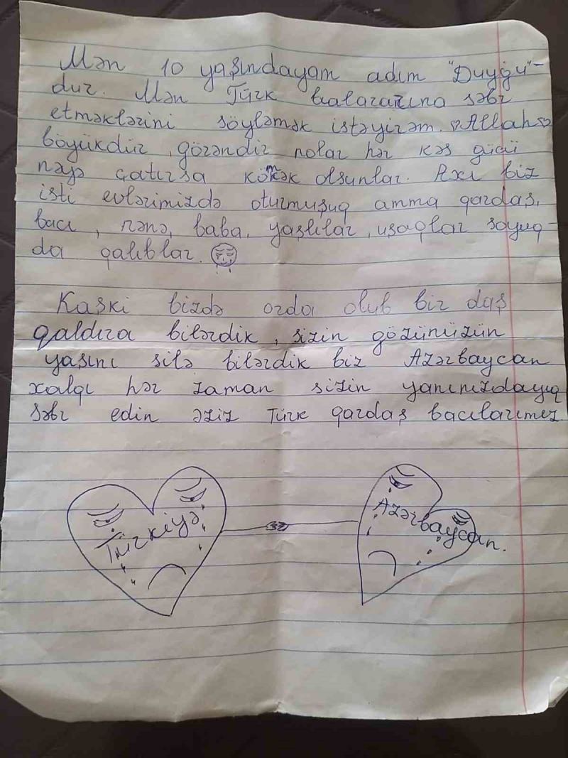 Kahramanmaraş’ta meydana gelen depremlerin ardından Azerbaycan’dan Elbistan’a gönderilen yardım kutularının içinden çıkan mektup duygulandırdı. 10 yaşındaki Duygu kendi el yazısıyla duygularını aktardığı mektupta, "Keşke biz de orada olabilseydik. Bir taş kaldırabilirdik. Sizin gözünüzün yaşını silebilirdik" ifadelerine yer verdi.
