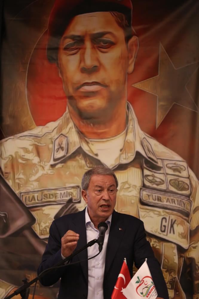 Mehmetçiğin terörle mücadeleye kararlılıkla devam ettiğini, Irak’ın kuzeyindeki terör yuvalarının tek tek teröristlerin başlarına yıkıldığını, Suriye’nin kuzeyinde kurulmak istenen terör koridorunun parçalandığını, teröristlerin kazdıkları çukurlara gömüldüğünü ifade eden Akar, “Terör bitmedi, mücadele aynı kararlılık ve azimle artan bir tempoda devam ediyor. Son 8 günde 39 terörist etkisiz hale getirildi” diye konuştu.