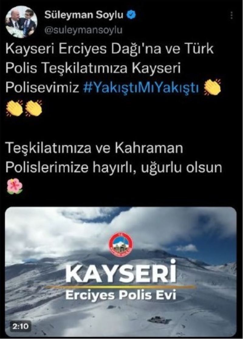 Bakan Soylu, sosyal medya hesabından yaptığı paylaşımda, “Kayseri Erciyes Dağı’na ve Türk Polis Teşkilatımıza Kayseri Polis Evimiz yakıştı mı yakıştı. Teşkilatımıza ve kahraman polislerimize hayırlı, uğurlu olsun” ifadelerine yer verdi.