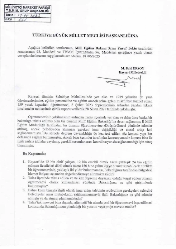 Milliyetçi Hareket Partisi (MHP) Kayseri Milletvekili Baki Ersoy; 6 Şubat depreminde hasar raporu aldıktan sonra yıkılan Kayseri Öğretmenevi’nin yeni binası için Milli Eğitim Bakanlığı’na soru önergesi verdi.