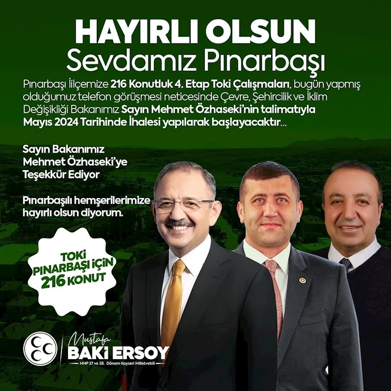 "Hayırlı Olsun Sevdamız Pınarbaşı! Pınarbaşı İlçemizde 216 Konutluk 4. Etap Toki Çalışmaları, bugün yapmış olduğumuz telefon görüşmesi neticesinde Çevre, Şehircilik ve İklim Değişikliği Bakanımız Sayın Mehmet Özhaseki’nin talimatıyla Mayıs 2024 Tarihinde İhalesi yapılarak başlayacaktır. Sayın Bakanımız Mehmet Özhaseki Beyefendi’ye teşekkür ediyor, Pınarbaşılı hemşerilerimize hayırlı olsun diyorum."