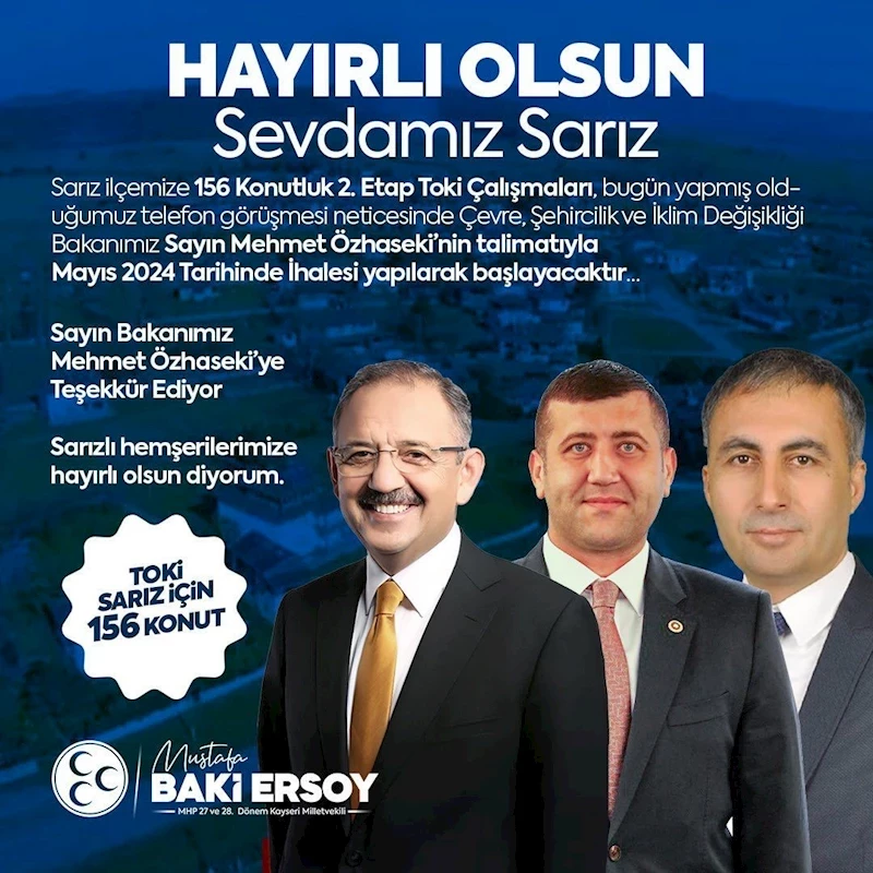 “Hayırlı Olsun Sevdamız Sarız! Sarız İlçemizde 156 Konutluk 2. Etap TOKİ Çalışmaları, bugün yapmış olduğumuz telefon görüşmesi neticesinde Çevre, Şehircilik ve İklim Değişikliği Bakanımız Sayın Mehmet Özhaseki’nin talimatıyla Mayıs 2024 Tarihinde İhalesi yapılarak başlayacaktır. Sayın Bakanımız Mehmet Özhaseki Beyefendi’ye teşekkür ediyor, Sarızlı hemşerilerimize hayırlı olsun diyorum.”