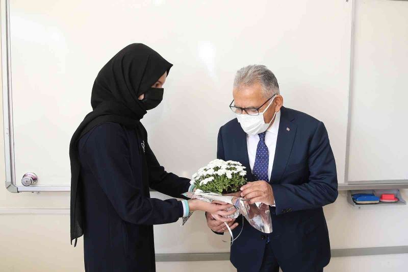 Başkan Büyükkılıç’a öğrenciler tarafından çiçek takdim edilirken, Büyükkılıç öğrenciler ile hatıra fotoğrafı çektirmeyi de ihmal etmedi.