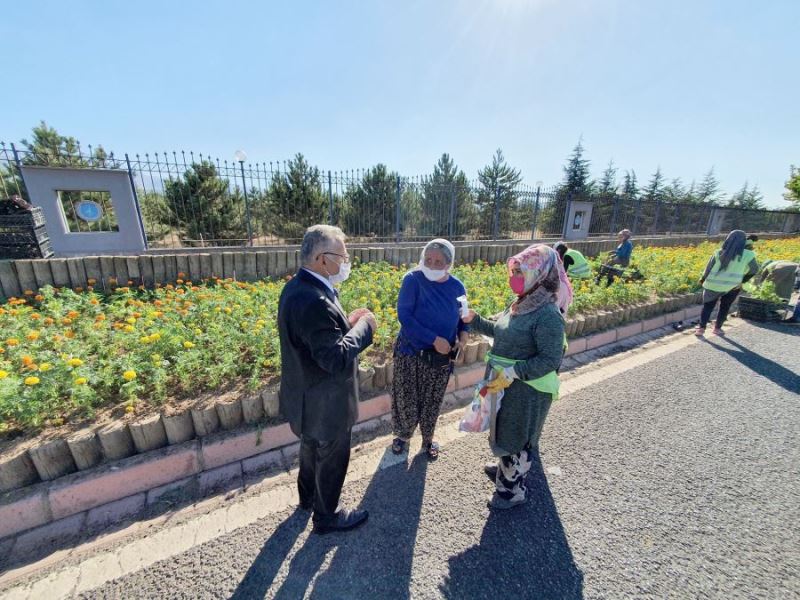 Gün içerisindeki programlarının ardından Talas Bulvarı üzerinde çiçek dikimi yapan işçilerin yanlarına uğrayan Büyükşehir Belediye Başkanı Memduh Büyükkılıç, burada işçilerle bir süre sohbet ederek özverili çalışmaları için teşekkür etti. Kadın işçilere maske dağıtan Başkan Memduh Büyükkılıç Kayseri’yi çiçeklerle donattıklarını ifade ederek şöyle konuştu: “Mevsim çiçekleri ile şehrimizi donatıyoruz. Çiçek gibi olan Kayserimize güzellikler katmaya çalışıyoruz. Her şeyden önce bu sıcakta çalışan canlarımıza minnet duyuyor, teşekkür ediyoruz. Sağ olsunlar, var olsunlar. Onların sevinci de bizim, tasası da bizim. Tabii ki bu arada maske eksiklikleri olan varsa onları da hatırlatarak maske de vermek suretiyle katkı sağlamaya çalışıyoruz. Çünkü onlar işin telaşıyla olayın ciddiyetinin farkına varmayabilirler ama kendilerini de çevrelerini de korumaları açısından maske, mesafe, temizlik olmazsa olmaz.”