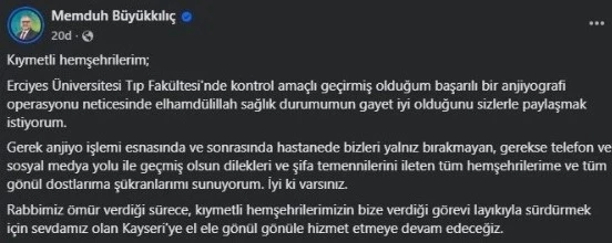 "Kıymetli hemşehrilerim; Erciyes Üniversitesi Tıp Fakültesi’nde kontrol amaçlı geçirmiş olduğum başarılı bir anjiyografi operasyonu neticesinde elhamdülillah sağlık durumumun gayet iyi olduğunu sizlerle paylaşmak istiyorum. Gerek anjiyo işlemi esnasında ve sonrasında hastanede bizleri yalnız bırakmayan, gerekse telefon ve sosyal medya yolu ile geçmiş olsun dilekleri ve şifa temennilerini ileten tüm hemşehrilerime ve tüm gönül dostlarıma şükranlarımı sunuyorum. İyi ki varsınız. Rabbimiz ömür verdiği sürece, kıymetli hemşehrilerimizin bize verdiği görevi layıkıyla sürdürmek için sevdamız olan Kayseri’ye el ele gönül gönüle hizmet etmeye devam edeceğiz."