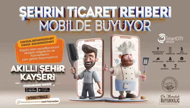 Büyükşehir, bu proje ile cep telefonlarından indirilen ‘Akıllı Şehir Kayseri’ uygulamasından veya https://www.kayseri.bel.tr/ozel-hizmetler web sitesi adresinden, kayıtlı olan esnafların iletişim bilgilerini ve hizmetlerini tüm şehre duyuruyor.