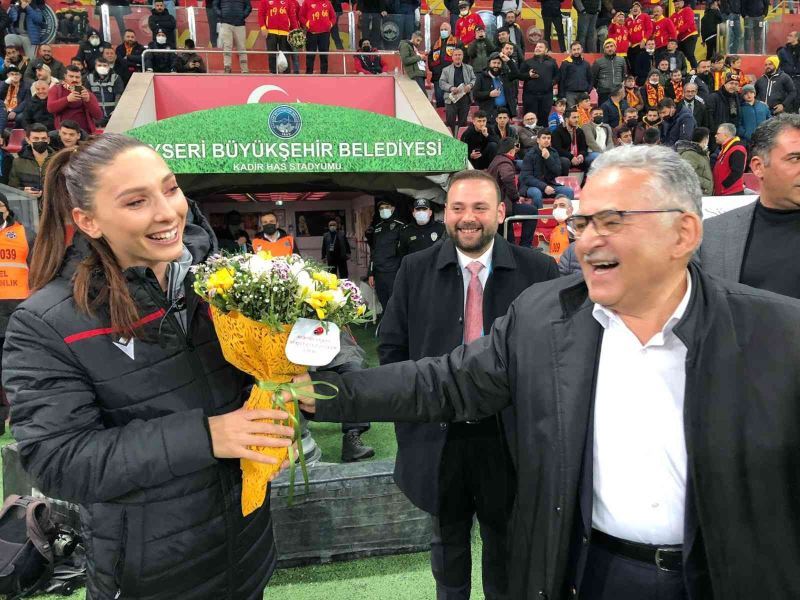 Kayseri Büyükşehir Belediye Başkanı Dr. Memduh Büyükkılıç, Yukatel Kayserispor-Alanyaspor maçı öncesi dördüncü hakem Gamze Durmuş Pakkan’a, 8 Mart Dünya Kadınlar Günü dolayısıyla çiçek takdim ederek, Kadınlar Günü’nü tebrik etti.