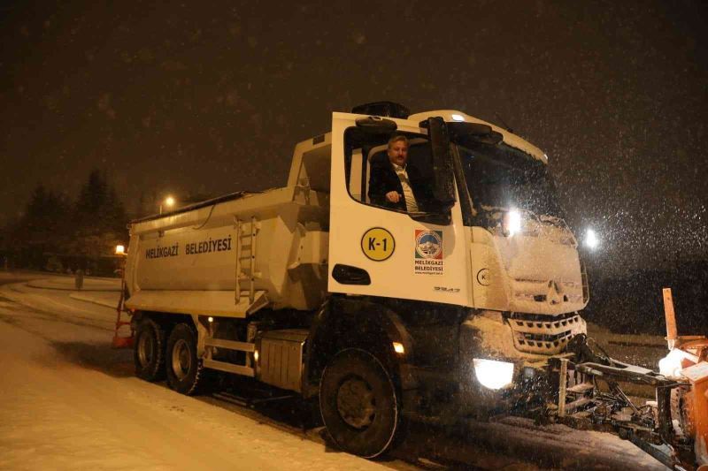 Melikgazi Belediye Başkanı Dr. Mustafa Palancıoğlu, karla mücadele ekiplerinin gece çalışmalarına katılarak kar kürüdü ve çalışanlarla sohbet etti.