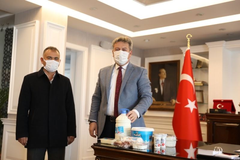 Melikgazi Belediyesi olarak yerli üretimi arttıracak bütün çalışmaları takdir ettiklerini ve desteklediklerini söyleyen Başkan Dr. Palancıoğlu, “Kayseri Damızlık Sığır Yetiştiricileri Birliği Başkanı Günay Çakı ve ekibi birlik tarafından içerisine katkı maddesi konulmadan doğal üretilen süt ve süt ürünlerinden ikram ettiler. Yerli ve katkısız üretimi önemini biliyor, daima destekliyoruz. Bu kapsamda kendilerine, yerli ve katkısız gıda üretiminin arttırılması ile ilgili gösterdikleri özveri için teşekkür ediyorum. Kendisiyle bölgedeki tarım ve hayvancılığın daha fazla gelişmesi için yapılacaklarımızı da görüştük. Birlik çalışmaları hakkında bilgiler de aktardılar. Hayvancılık üretimi aynı zamanda ekonomik kalkınmaya ve istihdama katkı sağlamaktadır. Bizde Melikgazi Belediyesi olarak ilçe genelinde hayvancılığın geliştirilmesi ve hayvansal doğal ürünlerin üretiminin daha verimli olması adına yapılması gereken çalışmalara her zaman destek olacağız.” dedi.
