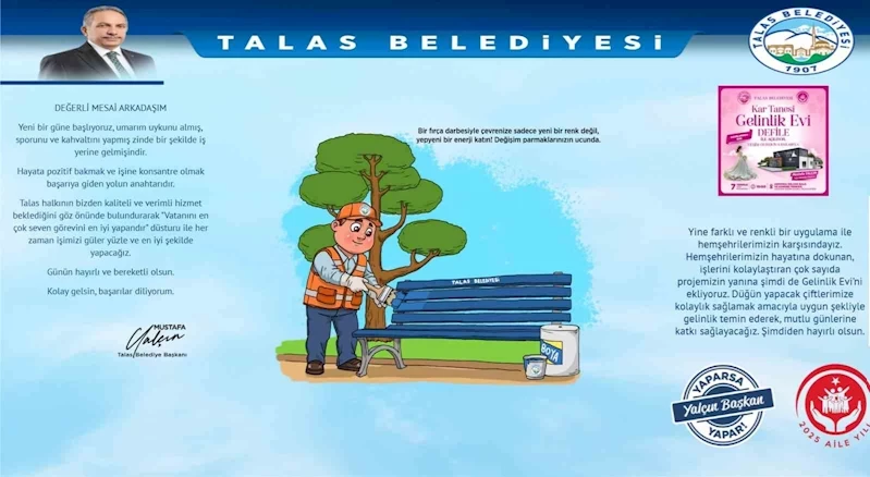 Başkan Yalçın mesajını; "Kolay gelsin, başarılar diliyorum" sözleriyle tamamlayarak personelin moral ve bağlılığını artırmayı hedefliyor. Bu anlamlı uygulama, belediyeciliği sadece teknik hizmetlerden ibaret görmeyen, insan odaklı bir anlayışın yansıması olarak dikkat çekiyor. Güleryüz, samimiyet ve iş ahlakının ön planda olduğu mesajlar, personelin görevine daha yüksek motivasyonla sarılmasına katkı sağlıyor. Öte yandan mesajda Talas Belediyesi’nin yeni yatırım ve hizmetlerinin duyurulduğu bölüm de yer alıyor. Son olarak hayata geçirilen ve Türkiye’de projesi yarışma ile belirlenen tek millet bahçesi olan Talas Millet Bahçesi’nin açılışıyla ilgili duyuru yer alıyor.