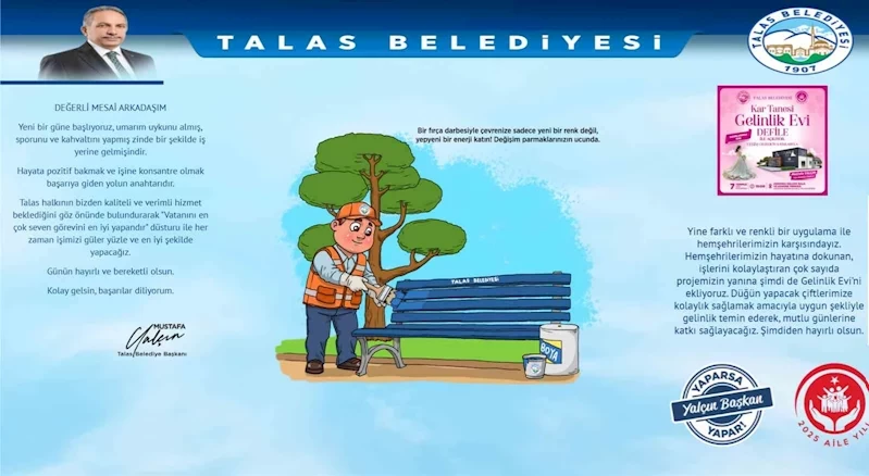 Bu anlamlı uygulama, belediyeciliği sadece teknik hizmetlerden ibaret görmeyen, insan odaklı bir anlayışın yansıması olarak dikkat çekiyor. Güleryüz, samimiyet ve iş ahlakının ön planda olduğu mesajlar, personelin görevine daha yüksek motivasyonla sarılmasına katkı sağlıyor. Öte yandan mesajda Talas Belediyesi’nin yeni yatırım ve hizmetlerinin duyurulduğu bölüm de yer alıyor. Son olarak hayata geçirilen ve Türkiye’de projesi yarışma ile belirlenen tek millet bahçesi olan Talas Millet Bahçesi’nin açılışıyla ilgili duyuru yer alıyor.