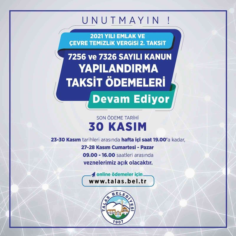 Talas Belediye Başkanı Mustafa Yalçın, Emlak ve Çevre Temizlik vergisinin 2. taksit ödemelerinin devam ettiğini belirterek ödeme için son tarihin 30 Kasım olduğu hatırlatmasında bulundu. Başkan Yalçın ayrıca daha önce yapılandırılmış vergilerin son ödeme gününün de 30 Kasım olduğuna dikkat çekti.