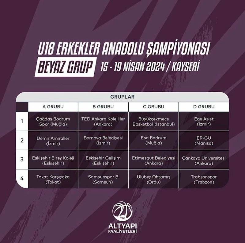 Türkiye Basketbol Federasyonu’nun 2023-2024 sezonu Yurt İçi Faaliyetleri Programı çerçevesinde düzenlediği U18 (Erkek-Kız) Anadolu Şampiyonaları katılımcıları belli oldu. U18 Anadolu Şampiyonaları Erkeklerde; Afyonkarahisar ve Kayseri, Kızlarda ise Sakarya ve Uşak illerinde düzenlenecek. 4 farklı şehirde 64 takımın yer aldığı U18 Anadolu Şampiyonalarında yaklaşık 800 sporcu ter dökecek. Kayseri’de oynanacak olan ErkeklerBeyaz Grup maçlarına katılacak takım ve grupları şöyle: