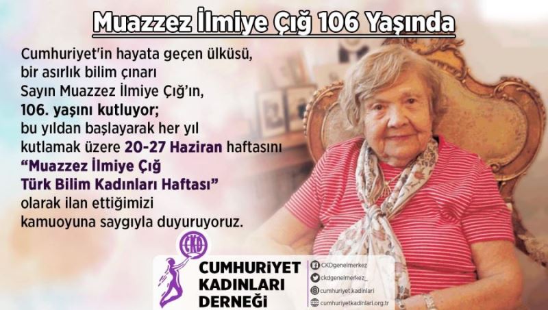 Bu düşünceyle CKD olarak, Muazzez İlmiye Çığ’ın doğum günü olan 20 Haziran’dan başlayan 20-27 Haziran haftasını “Muazzez İlmiye Çığ Türk Bilim Kadınları Haftası” olarak ilan etme ve her yıl kutlama kararı aldıkları kaydedilen açıklamada, şu ifadeler yer aldı: