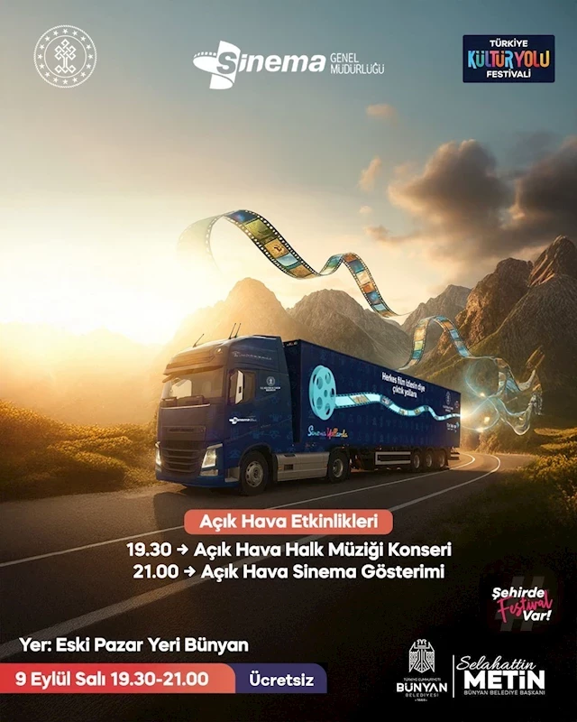 Etkinlik, 9 Eylül Salı günü 19.30 - 21.00 saatleri arasında Eski Pazar Yeri’nde gerçekleştirilecek. Programda açık hava sinema gösterimi ve halk müziği konseri yer alacak. Bünyan Belediye Başkanı Selahattin Metin; "Tüm hemşehrilerimizi kültür ve sanatla dolu bu güzel akşamı birlikte yaşamaya davet ediyorum. Gelin, hep birlikte keyifli bir gece geçirelim" dedi.