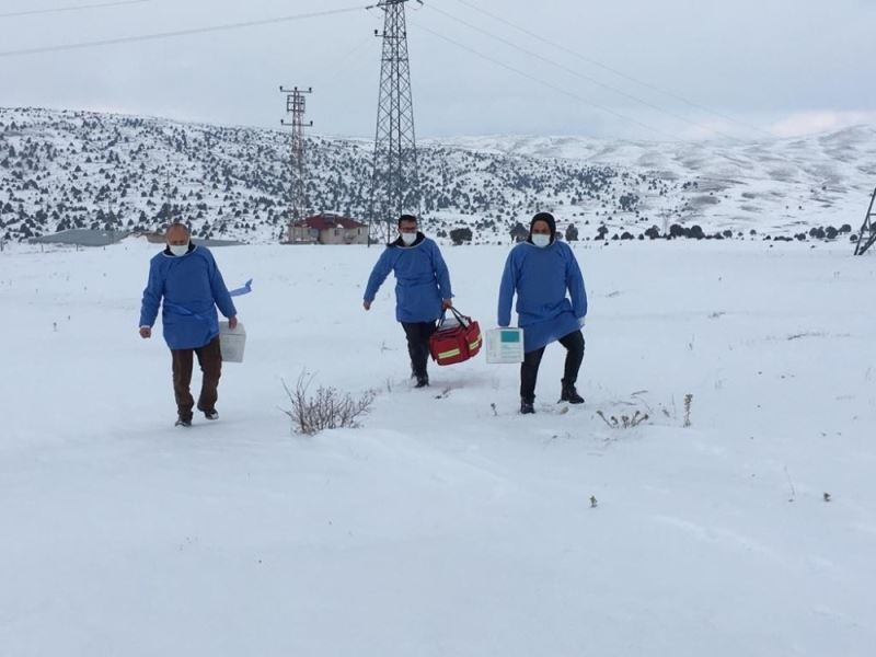 Kayseri’nin Sarız ilçesinde sağlık çalışanları, zorlu kış şartlarına rağmen bütün zorlukları aşarak yaşlıların aşılamasını yapıyor.