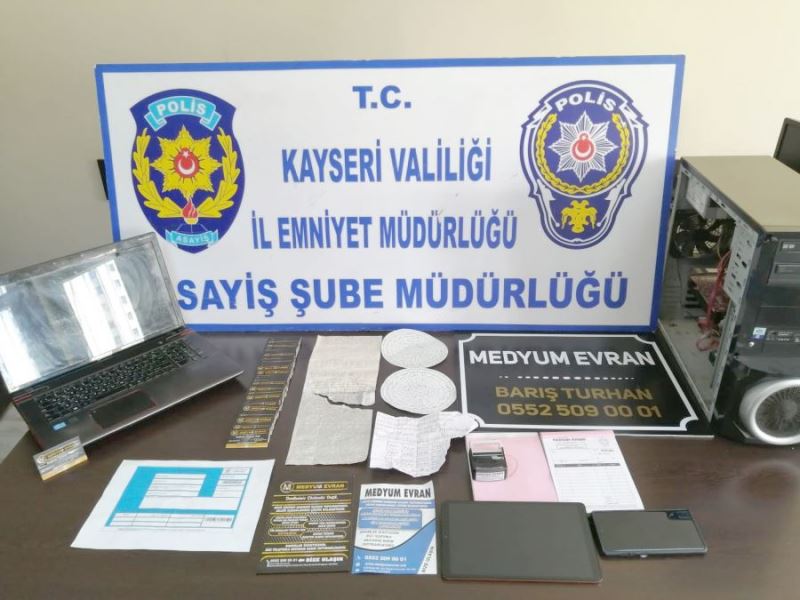 Edinilen bilgiye göre Almanya’da yaşayan F.D., internet üzerinden irtibata geçtiği kendisini medyum olarak tanıtan ve manevi rahatsızlıkları tedavi ettiğini iddia eden B.T.’ye kendisinde büyü olduğunu belirterek büyü bozma karşılığı 35 bin euro para verdi. F.D., rahatsızlıklarının geçmemesi üzerine dolandırıldığını iddia ederek şikâyetçi oldu. Kayseri İl Emniyet Müdürlüğü Asayiş Şube Müdürlüğüne bağlı Yankesicilik ve Dolandırıcılık Büro Amirliğince yapılan çalışmalarda B.T.’nin Kocasinan ilçesinde ofis açtığını tespit etti. B.T. ofisine düzenlenen operasyonla alınırken ikamet ve ofisinde yapılan aramalarda muska tabir edilen el yazması kağıtlar, makbuzlar, kaşe ve kartvizitlere ele geçirildi.