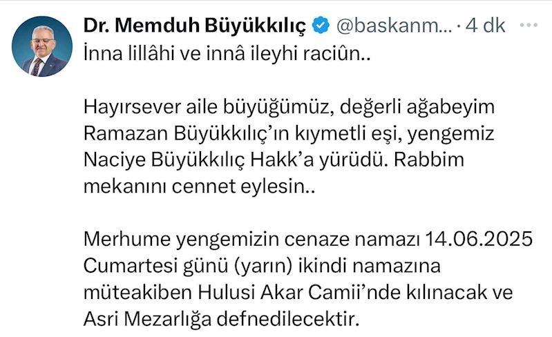 Başkan Büyükkılıç, yengesinin vefatı ile ilgili yaptığı sosyal medya paylaşımında, "İnna lillâhi ve innâ ileyhi raciûn. Hayırsever aile büyüğümüz, değerli ağabeyim Ramazan Büyükkılıç’ın kıymetli eşi, yengemiz Naciye Büyükkılıç Hakk’a yürüdü. Rabbim mekanını cennet eylesin. Merhume yengemizin cenaze namazı 14.06.2025 Cumartesi günü ikindi namazına müteakiben Hulusi Akar Camii’nde kılınacak ve Asri Mezarlığa defnedilecektir" ifadelerine yer verdi.