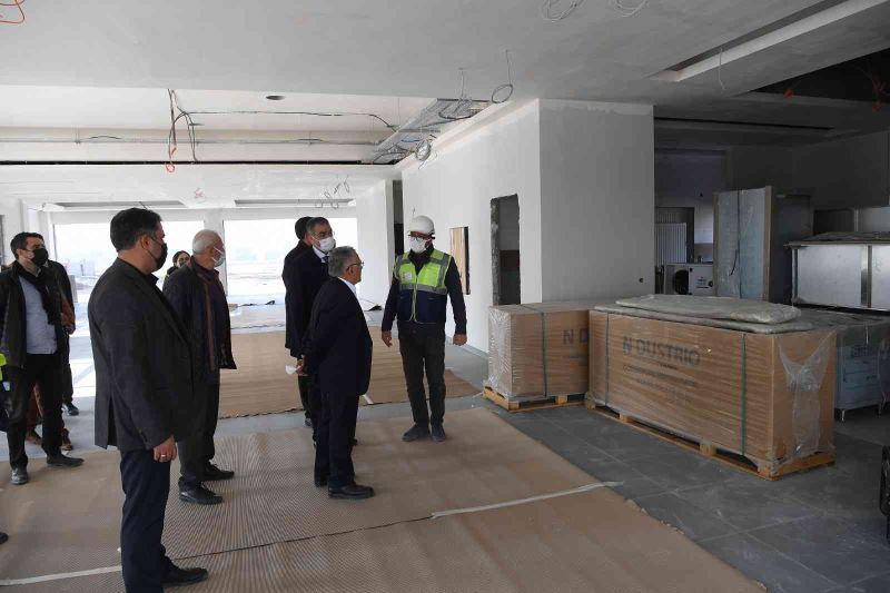 Kıraathane inşaatını gezen Büyükkılıç, Genel Sekreter Yardımcısı Hamdi Elcuman ve yüklenici firma yetkililerinden bilgiler aldı.