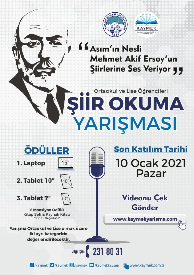 Kayseri Büyükşehir Belediyesi KAYMEK A.Ş, Milli Şair Mehmet Akif Ersoy’un 27 Aralık’taki ölüm yıldönümü münasebetiyle “Asım’ın Nesli, Akif’in Şiirlerine Ses Veriyor” adıyla Şiir Seslendirme Yarışması düzenliyor. Bu kapsamda Kayseri il sınırları içerisinde eğitim gören ortaokul ve lise öğrencileri Mehmet Akif Ersoy’un şiirlerine ses verecekler.
