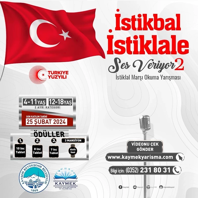 Kayseri Büyükşehir Belediyesi Kayseri Mesleki Eğitim ve Kültür A.Ş. (KAYMEK) tarafından 12 Mart İstiklal Marşı’nın kabulü konusunda ‘İstikbal İstiklale Ses Veriyor’ sloganıyla 2’ncisi düzenleniyor. Yarışmada birbirinden değerli çalışmalar, jüri heyeti tarafından değerlendirilerek, dereceye girenlere ödüller verilecek.