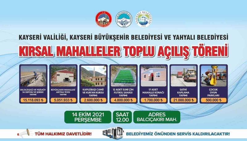 Tören kapsamında, 15 milyon 118 bin 93 TL Delialiuşağı ve Yeşilköy Su Deposu ve Şebeke Yapımı, 5 milyon 51 bin 933 TL’lik Büyükçakır Mahallesi Arıtma Tesisi, 2 milyon 600 bin TL’lik Kapuzbaşı Camii ve Kur’an Kursu yapımı, 4 milyon 800 bin TL’lik 12 adet suni çim futbol sahası yapımı, 1 milyon 700 bin TL’lik 17 adet mahalle konağı yapımı, 21 milyon TL’lik sathi asfalt kaplama yapımı ve 500 bin TL’lik Çocuk Oyun Parkları olmak üzere 50 milyon TL’yi aşkın kırsal mahallelere yatırımın toplu açılışı yapılacak.