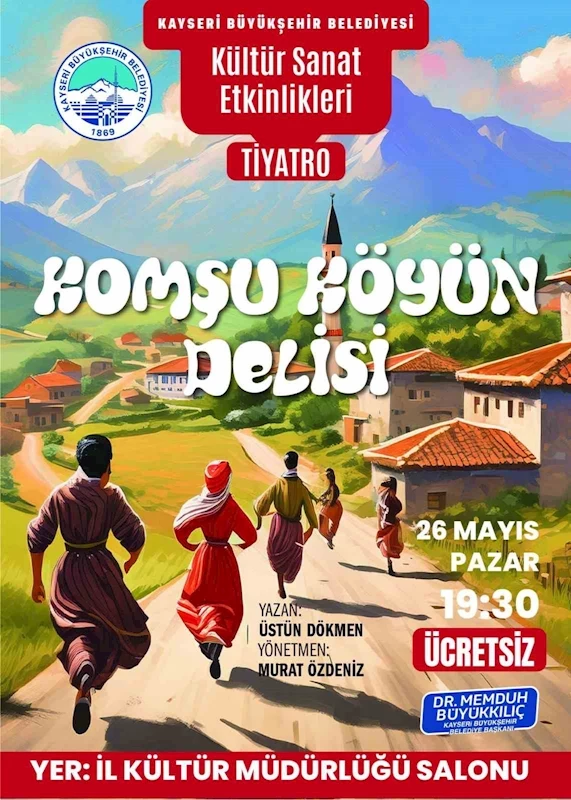 Kayseri Büyükşehir Belediyesi Sanat Akademisi öğrencileri tarafından hazırlanan Üstün Dökmen’in yazdığı "Komşu Köyün Delisi" adlı tiyatro oyunu Murat Özdeniz yönetmenliğinde 26 Mayıs Pazar günü tiyatro severlerle buluşuyor.
