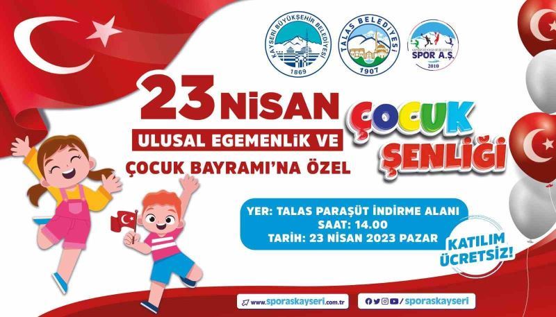 Türkiye Cumhuriyeti’nin kurucusu Gazi Mustafa Kemal Atatürk tarafından tüm dünya çocuklarına armağan edilen 23 Nisan Ulusal Egemenlik ve Çocuk Bayramı’nda Kayseri Büyükşehir Belediyesi Spor A.Ş. 23 Nisan’a özel olarak ‘Çocuk Şenliği’ düzenleyecek. Büyükşehir’in ‘Çocuk Şenliği’nde doyasıya eğlenecek çocuklar, şişme oyun alanları, masa oyunları, birbirinden farklı sportif oyun alanları, sahne gösterileri ve eğlence aktiviteleriyle dolu keyifli bir bayram geçirecek.