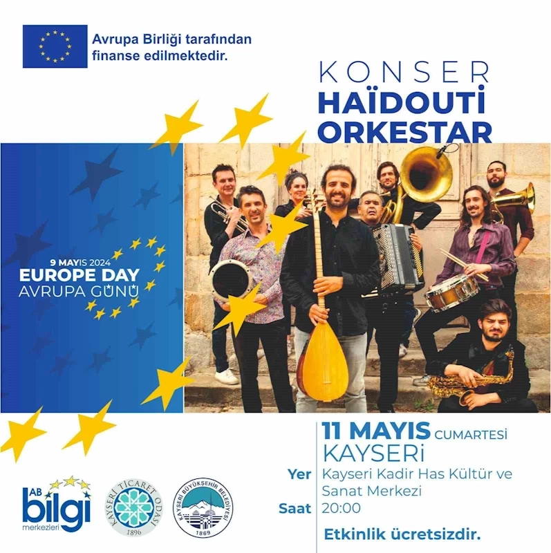 Kayseri Büyükşehir Belediyesi, Avrupa Günü etkinlikleri kapsamında Avrupa, Balkan ve Türk ezgilerini uluslararası sahnelere taşıyan Hadouti Orkestrası konserine ev sahipliği yapacak.
