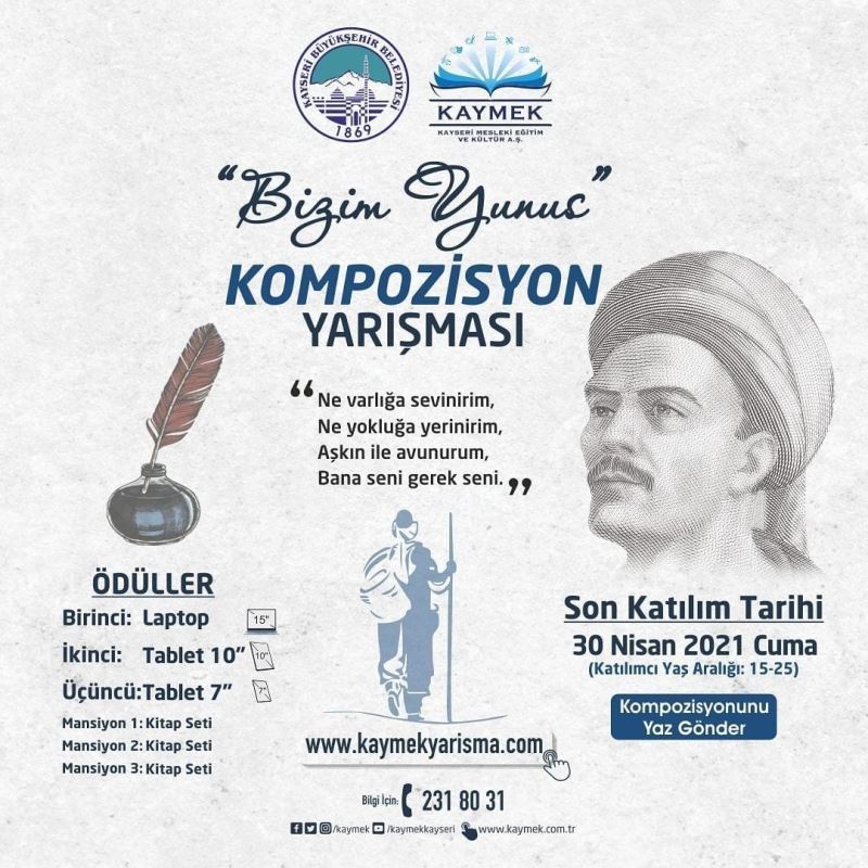 Bu kapsamda KAYMEK tarafından ‘Bizim Yunus’ adlı ödüllü kompozisyon yarışması düzenleneceğini söyleyen Büyükkılıç, “KAYMEK’imizin eğitim ve kültür faaliyetleri hız kesmeden devam ediyor. Anadolu’da Türkçe şiirin öncüsü olan tasavvuf ve halk şairi Yunus Emre’nin gençlerimiz tarafından anlaşılması büyük önem taşıyor” dedi.