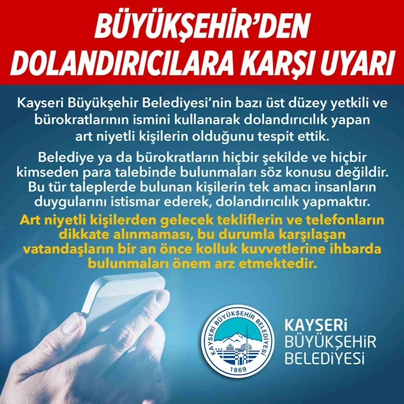 Kayseri Büyükşehir Belediyesi, bazı üst düzey yetkili ve bürokratların ismini kullanarak dolandırıcılık yapan art niyetli kişilere karşı vatandaşları uyardı.