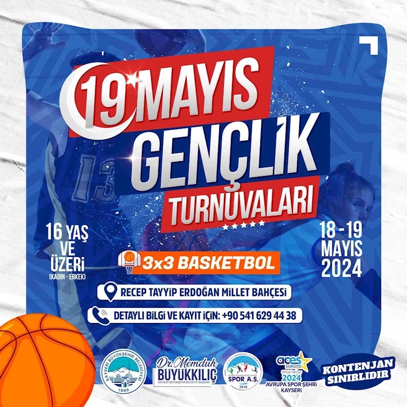 Kayseri Büyükşehir Belediyesi Spor A.Ş., 19 Mayıs Atatürk’ü Anma, Gençlik ve Spor Bayramı kutlamaları kapsamında 19 Mayıs Gençlik Turnuvası 3x3 Basketbol etkinliği düzenleyecek.