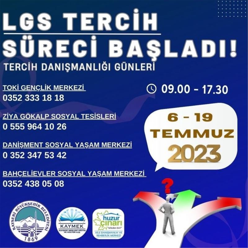 Kayseri Büyükşehir Belediyesi’nin ‘öğrenci dostu’ hizmet anlayışıyla düzenlediği Tercih Danışmanlığı Günleri bu kez Liselere Geçiş Sistemi (LGS) tercih süreci için başladı. Büyükşehir bünyesinde faaliyet gösteren Kayseri Mesleki Eğitim ve Kültür A.Ş.’nin (KAYMEK) Huzur Çınarı Aile Danışmanlık ve Rehberlik Merkezi uzmanlarınca öğrencilere tercih süresi boyunca ücretsiz tercih danışmanlığı ve rehberlik hizmeti veriliyor.