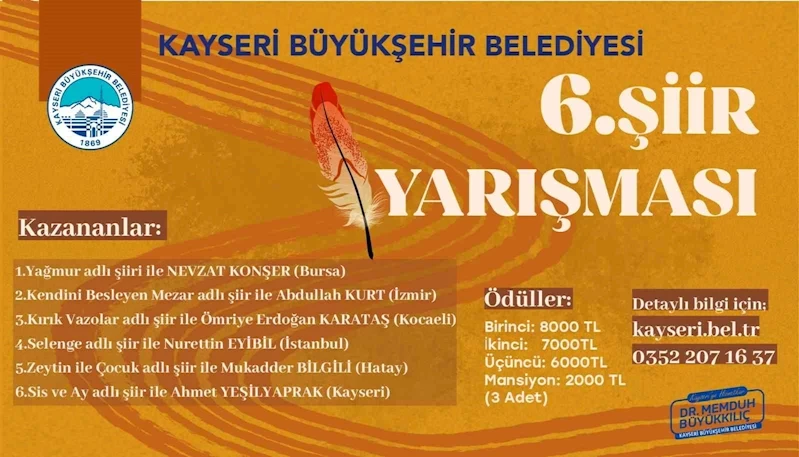Şiir dünyasına gönül vermiş her vatandaşın katıldığı, konusunun serbest olarak belirlendiği ve seçkin jüri üyesi bulunan 6’ncı Şiir Yarışması’nda, birbirinden nadide şiirler dereceye girmek için yarıştı. Yarışmanın seçici kurulunda Şair Prof. Dr. Nurullah Genç, Şair Yavuz Bülent Bakiler, Şair Hayati İnanç, Şair Prof. Dr. Ömür Ceylan, Şair Prof. Dr. Mehmet Can Doğan, Şair Mehmet Aycı, Şair Ali Günvar, Kayseri Büyükşehir Belediyesi Genel Sekreter Yardımcısı Serdar Öztürk ve Kayseri Büyükşehir Belediyesi Kültür ve Sosyal İşler Daire Başkanı Salih Özgüncü yer aldı.