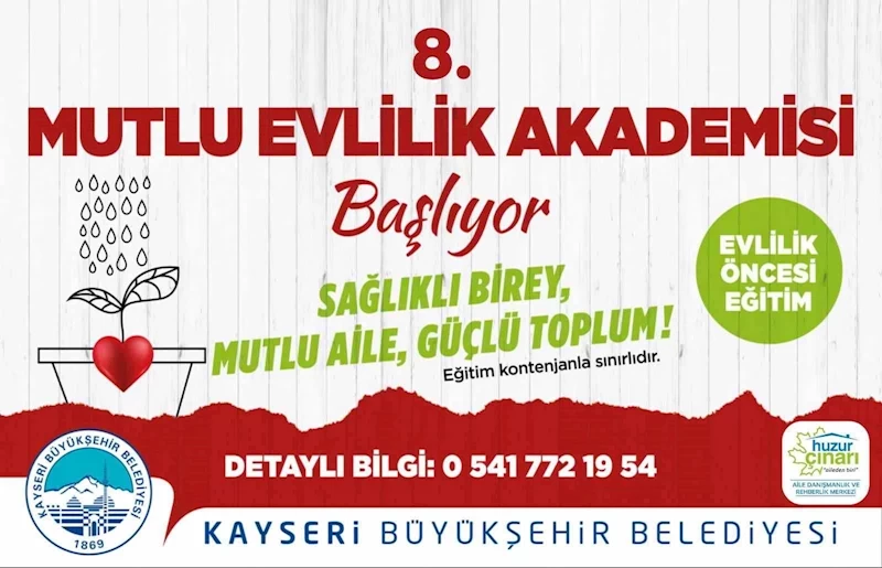 Kayseri Büyükşehir Belediyesi, sosyal belediyecilik alanında da faaliyetlerini sürdürüyor. Bu çerçevesinde KAYMEK A.Ş. Huzur Çınarı Aile Danışmanlık ve Rehberlik Merkezi’nin aile kurumunun sağlıklı bir şekilde kurulmasına destek vermek amacıyla 8’ncisini düzenleyeceği ‘Mutlu Evlilik Akademisi’ eğitimlerinin kayıtları başladı.