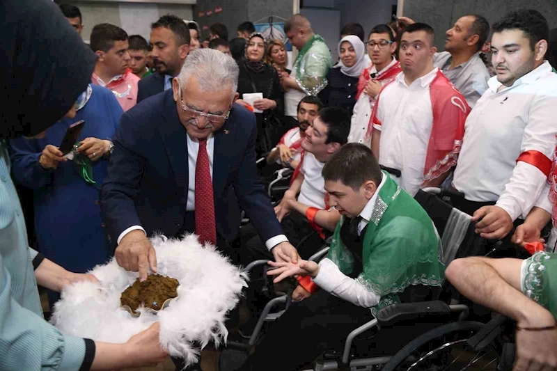 Büyükşehir Belediyesi, zihinsel ve fiziksel engelleri nedeniyle yaşıtları gibi askere gidemeyen bireylerin vatani görevlerini yerine getirebilmeleri için Besime Özderici Engelsiz Yaşam Merkezi’nde ilk olarak temsili asker kınası düzenledi. Büyükşehir Belediye Başkanı Dr. Memduh Büyükkılıç’ın da katıldığı etkinlikte, temsili askerlik yapacak olan gençlerin omuzlarına asker tülbentleri takılırken, öğrencilerin ellerine kına yakıldı. Etkinlikten çok duygulan aileler ise Başkan Büyükkılıç’a böyle anlamlı bir etkinlik ile kendilerini buluşturdukları için teşekkürlerini ilettiler. Çok güzel duygular içerisinde olduğunu ifade eden Nurgül Karslıoğlu, Büyükşehir Belediyesi’nin hayallerini gerçekleştirdiğini dile getirerek, şöyle konuştu;