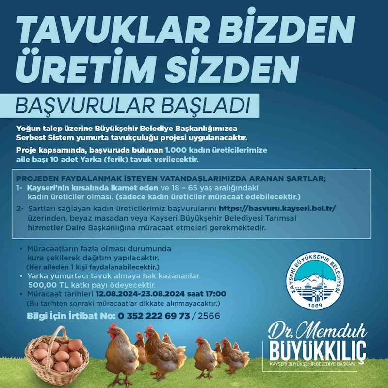 Kırsalda üretim yapan ya da yapmak isteyen kadın vatandaşlara yönelik ‘Kayseri’de Serbest Sistem Yumurta Tavukçuluğu’nun Yaygınlaştırılması Projesi’ çerçevesinde başvurular 12 Ağustos 2024 Pazartesi başladı.